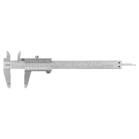 - Con bloqueo por tornillo y una longitud total de 150 mm y una longitud de las bocas de 38 mm. Escala Nonio 1/128” y 1/20mm. DIN 862.