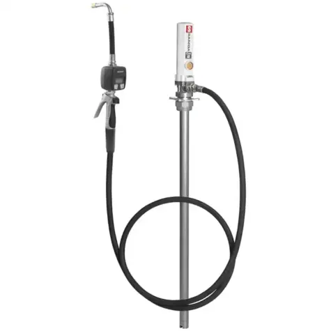Bomba neumática de acoplamiento directo a bidón equipada con manguera de servicio y pistola contadora electrónica. Indicada para utilización con todo tipo de aceites hasta SAE 90.