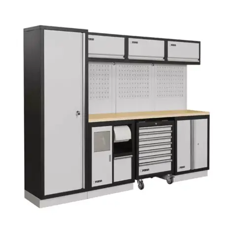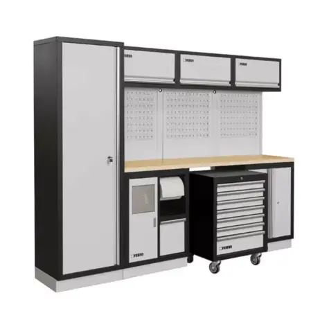La solución óptima para amueblar su taller, su garaje o su esquina racing . Kit armarios, paneles, estanterías, taquilla y accesorios con carro.