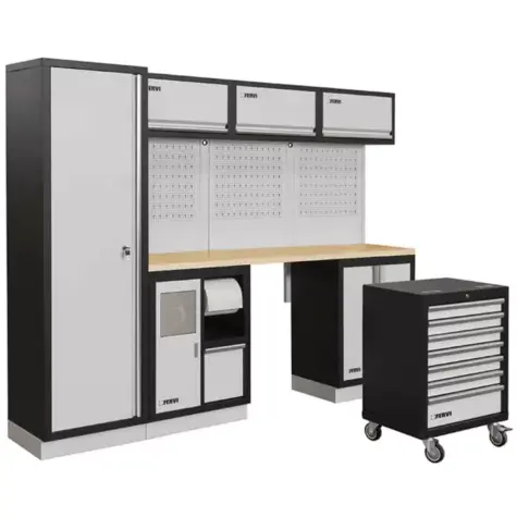 Mobiliario de taller modular FERVI A007E para amueblar talleres, garajes o puestos de trabajo, el mobiliario hace que todo sea más funcional y estéticamente profesional.