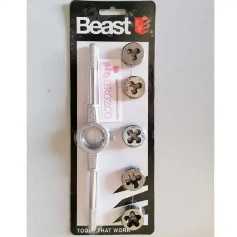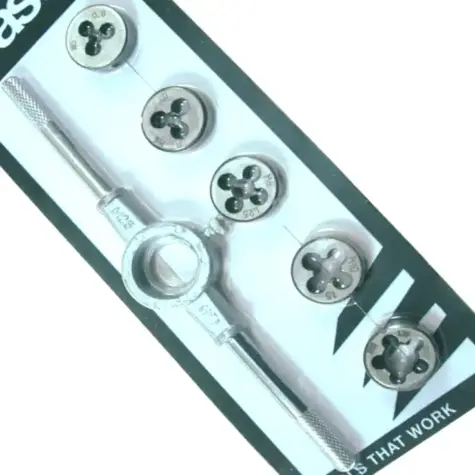 fileras tamaños / medidas : 6 x 1,0 , 7 x 1,0 , 8 x 1,25 ,10 x 1,50 y 12 x 1,75 - disponemos tambien de juegos de machos para roscas y otros tipos de cojinetes en pulgadas para roscar tubos.