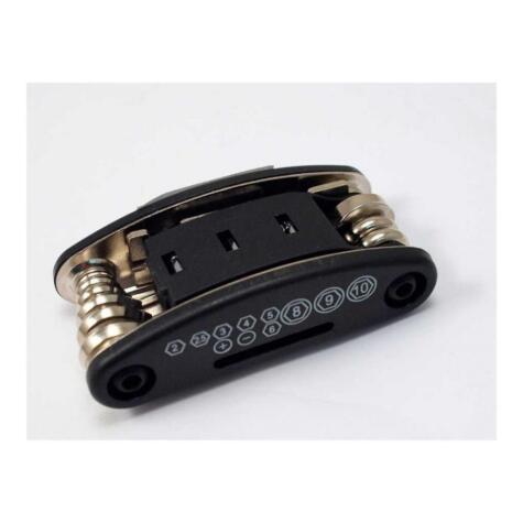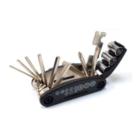16 llaves indispensables para la reparación de bicis en navaja. Incluye: llaves allen, destornilladores plano, estrella y también llave tuercas.