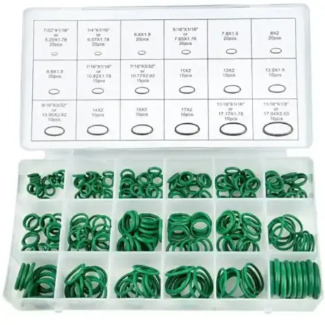 Surtido Juntas Tóricas Verdes, para aire acondicionado y otros, presentado en estuche con compartimentos etiquetado y Contiene las 18 medidas más usadas.